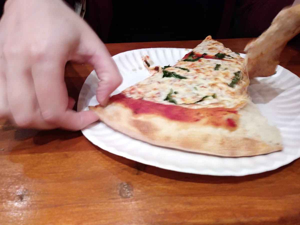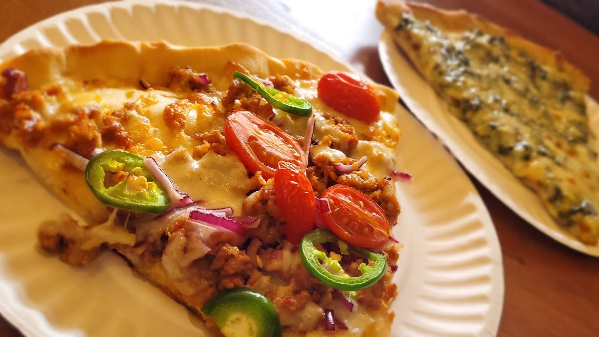 This pizza is so excellent! I love the spicy jalapeños, tomatoes, red onion, and italian spicy sausage pizza slice. I also loved the spinach and cheese slice my wife ordered. It tasted like quiche or creamy spinach on pizza, and it was amazing! I highly recommend this pizza if you are in NY or Danbury Connecticut or anywhere nearby it is probably worth driving 30 minutes (or more) just to experience this flavor perfection I was pleased with the service, attitude of the lead man, and health safety of them all. I feel I trust these guys with my pizza!